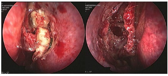 Fig. 4: Endoscopic findings of nasal packing immediately after functional endoscopic sinus surgery (FESS). In this patient, the left sinuses were packed with four pieces of dry Gelfoam pasted with terramycin ointment (left) and the right side was left without packing (right) [4].